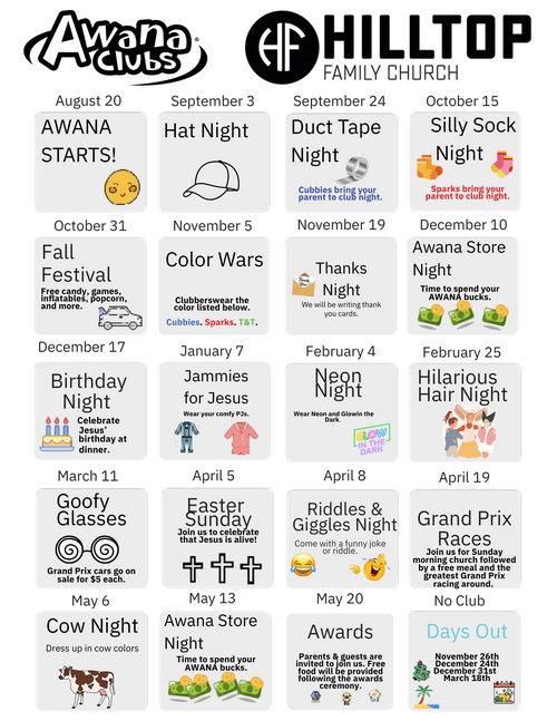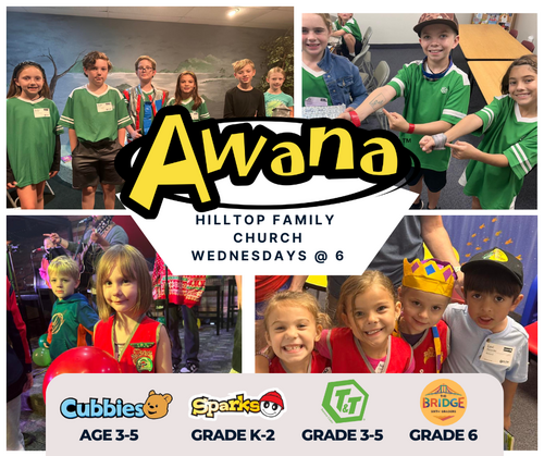During the school year HFC participates in the AWANA program designed for kids 3 years old through 5th grade on Wednesday nights starting at 6:00pm.